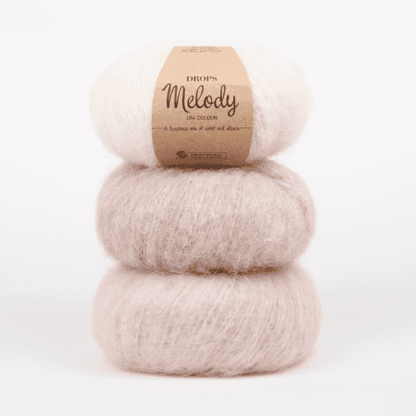 Being so soft and light, DROPS Melody is a great choice for oversize garments as well as accessories. It knits up quickly with big needles without the piece becoming heavy and it can be used as an effect yarn together with other qualities, to give garments extra volume and softness.