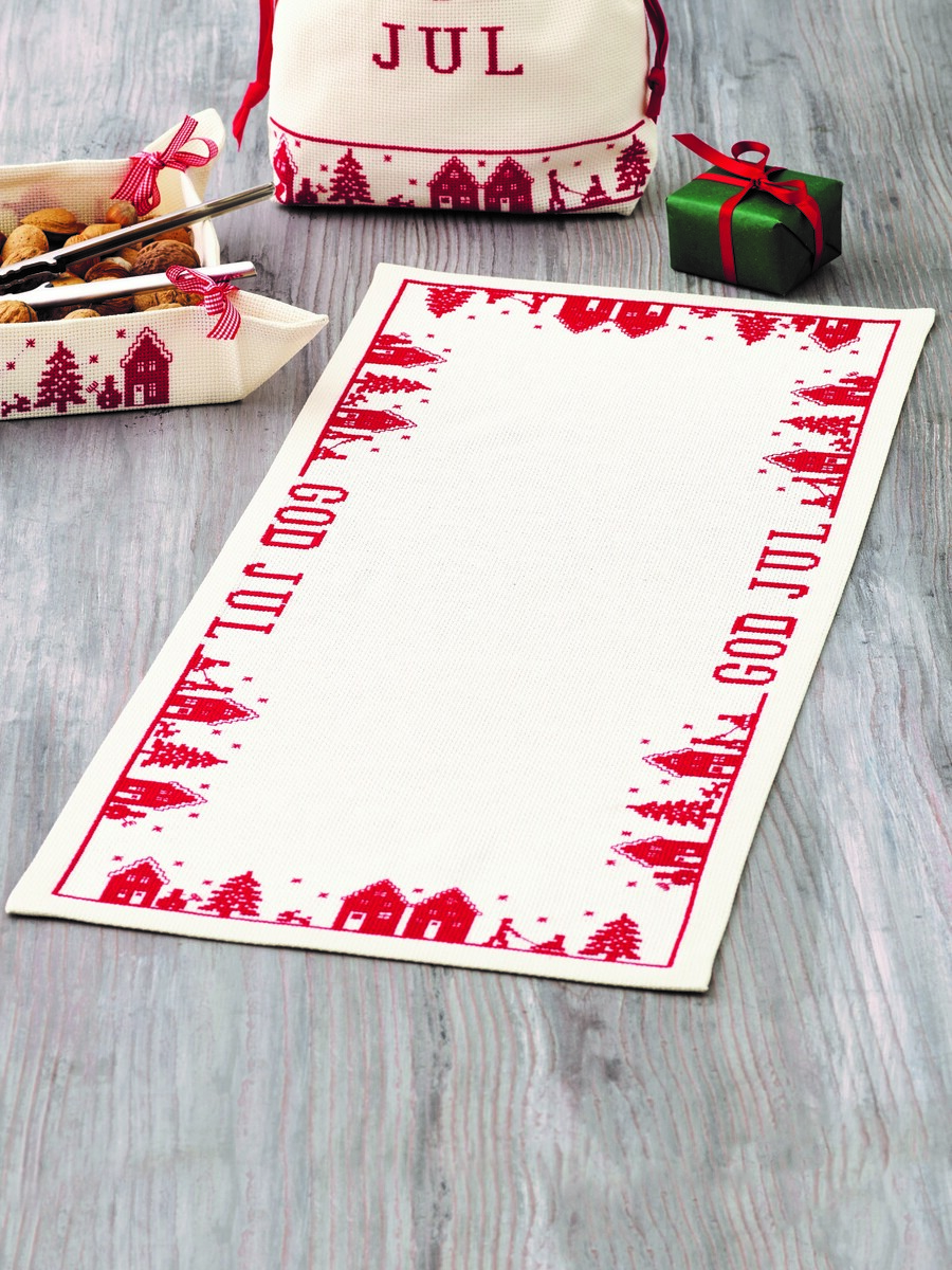 With this lovely embroidery kit, you can create your own embroidery featuring houses and the text "Merry Christmas" in danish