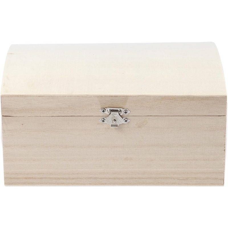 Treasure chest in wood with curved lid and lock in metal.