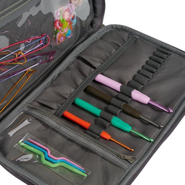 This yarn bag is perfect for keeping your knitting supplies organized and in one spot. The dark grey colour is perfect for matching with all your outfits too, and the zipper pocket helps to keep everything secure. Plus, the various divisions make it easy to find what you're looking for. Keep your knitting on hand with this handy yarn bag!