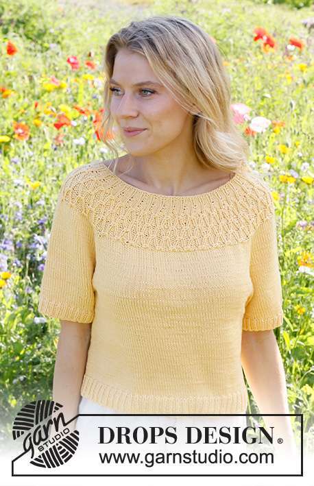 Knitted jumper with short sleeves / t-shirt in DROPS Muskat. Piece is knitted top down with round yoke and cables. Size S-XXXL.
