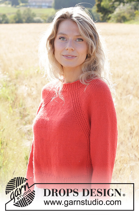 Knitted jumper in DROPS Daisy. The piece is worked top down with raglan, relief-pattern, split in sides and I-cord. Sizes S - XXXL.
