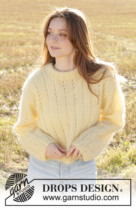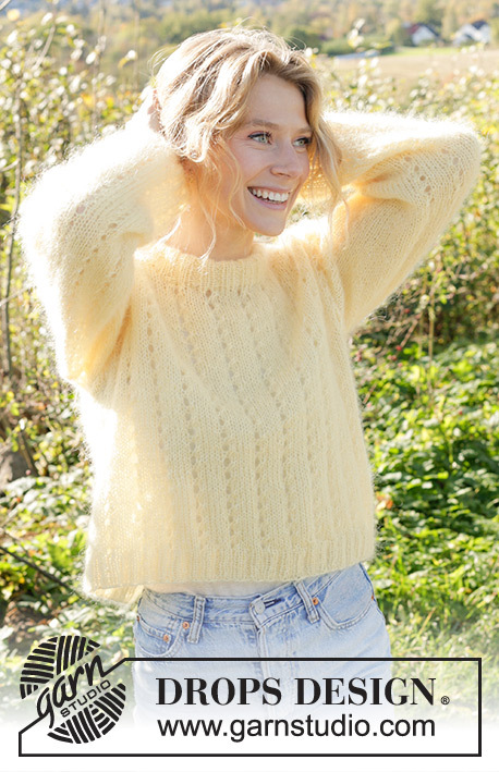 Knitted jumper in 3 strands DROPS Kid-Silk. The piece is worked bottom up with lace pattern and double neck. Sizes XS - XXL.