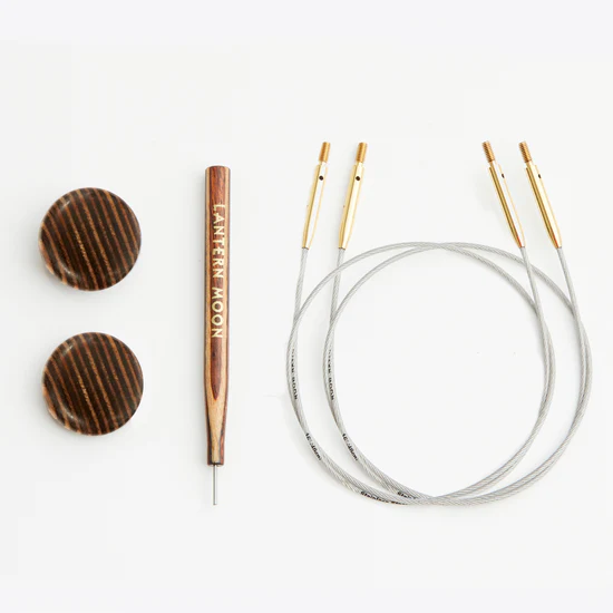 Lantern Moon Cables are made from nylon-coated stainless steel, offering both flexibility and strength. The cables feature 24K gold-plated brass connections, providing a smooth transition between cable and needle, allowing your stitches to glide effortlessly. This cable set is both elegant and functional, making it ideal for any knitting project.