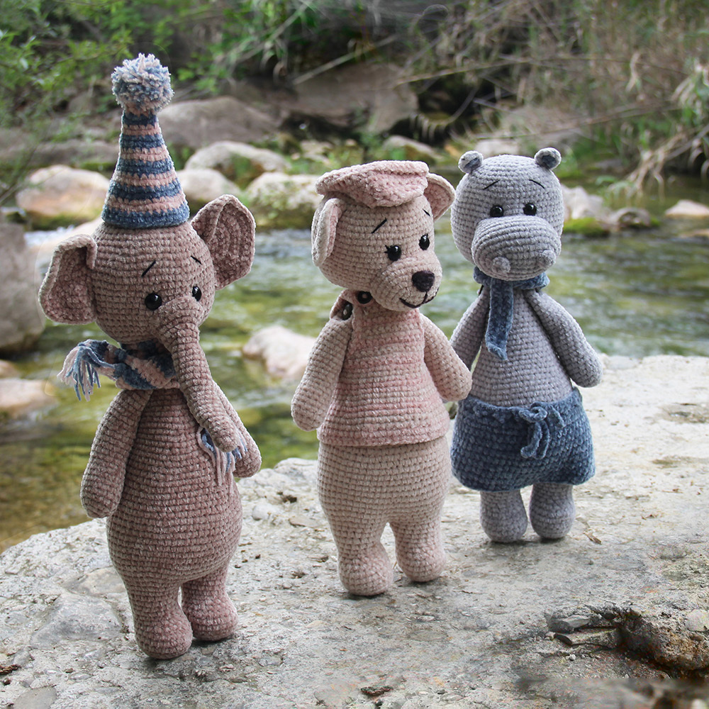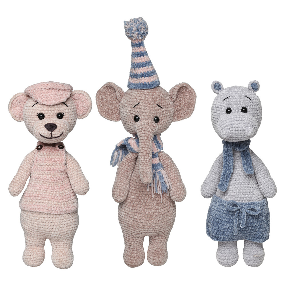Crocheted animals in Go Handmade Bohème Velvet "fine". The kit includes materials to create one of each animal.