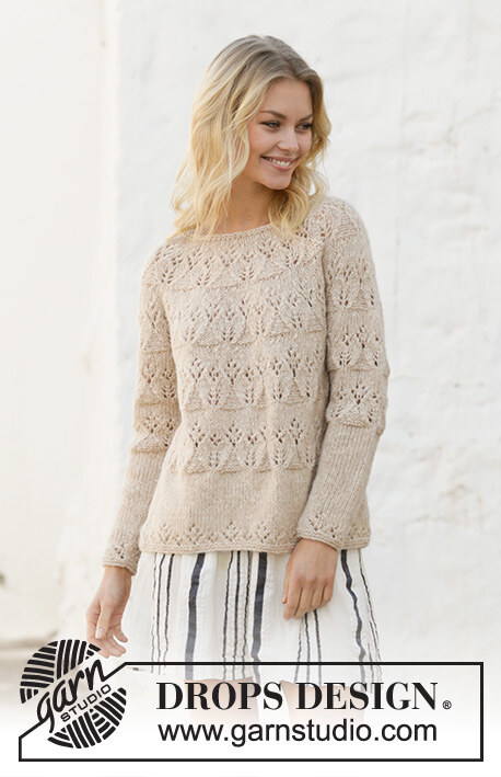 Knitted jumper with round yoke in DROPS Air. Piece is knitted with lace pattern. Size: S - XXXL