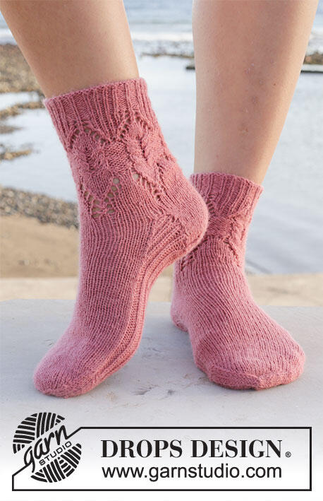 Knitted socks in DROPS Nord. Piece is knitted top down with cables and lace pattern. Size 35 to 43