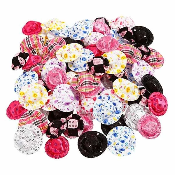 Pack of 100 minihats with assorted patterns.