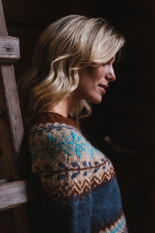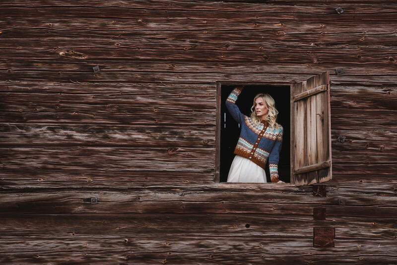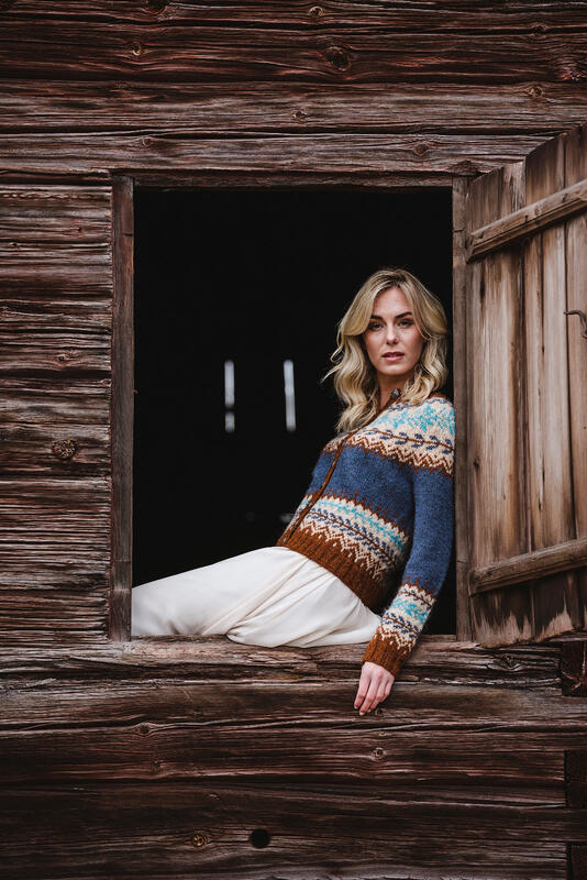 Maja is a cropped yoke cardigan with a modern flair. Like in many traditional lopi sweaters, the main yoke pattern is echoed in the cuffs and at the bottom of the sweater but with unusually long motifs. The body and sleeves are knitted in the round. At the armholes, they are combined on one needle and the motif knitted. The neckline ends with a few short rows to lift the back. The cardigan is steeked, stitches are picked up along the edges and the button bands knitted.