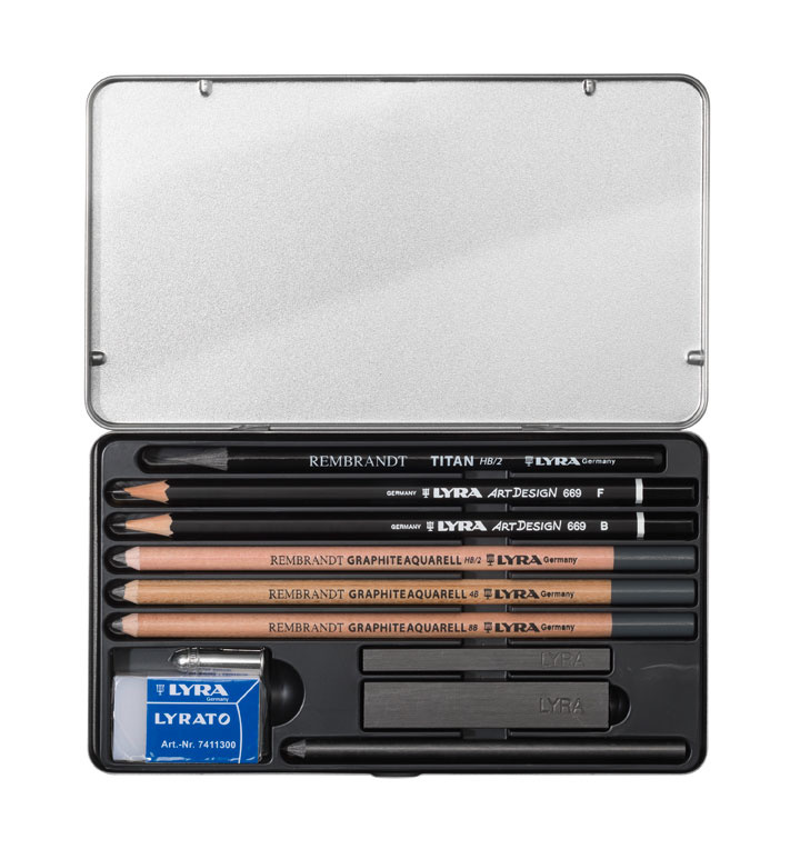 • Includes: 11-piece set: 1 Titan pencil (HB), 1 Art Design graphite pencil (F), 1 Art Design graphite pencil (B), 1 Water-soluble graphite pencil (HB), 1 Water-soluble graphite pencil (4B), 1 Water-soluble graphite pencil (8B), 1 Graphite Stick (7x7 mm - 4B), 1 Graphite stick (7x14 mm - 6B), 1 Graphite pencil (2B), 1 rubber, 1 Pencil cap.