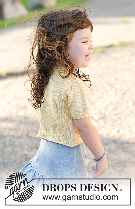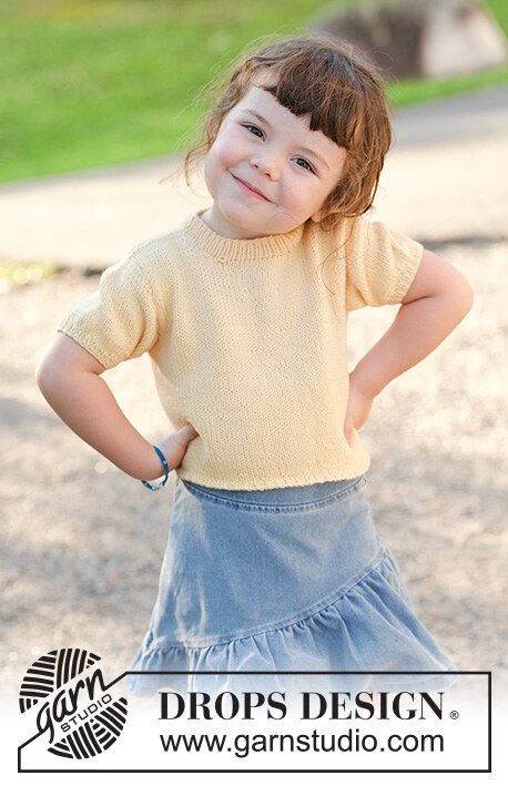 Knitted jumper for children in DROPS Cotton Merino. Piece is knitted bottom up with short sleeves and buttoning over the shoulder. Size 2 - 12 years.