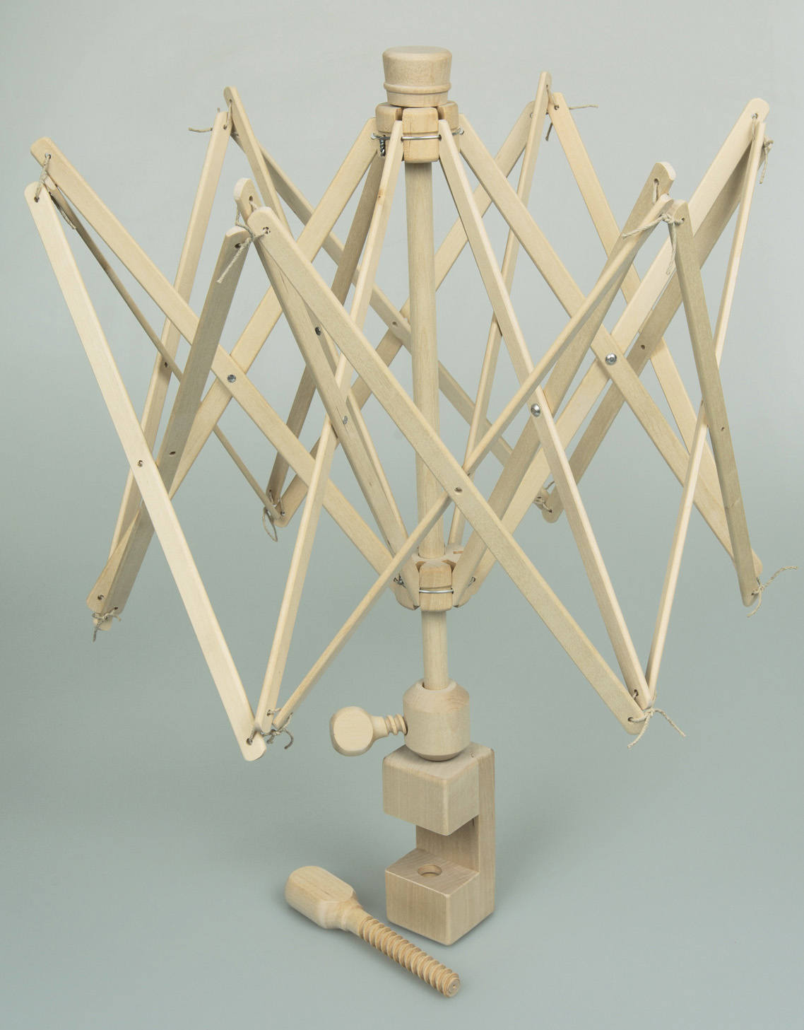 Yarn winder in wood, with clamp. Can be expanded to 75 cm in diameter.
