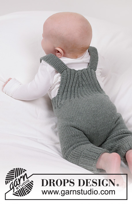 Knitted pants with straps for baby in DROPS Merino Extra Fine. Piece knitted top down with rib. Size 0 - 4 years