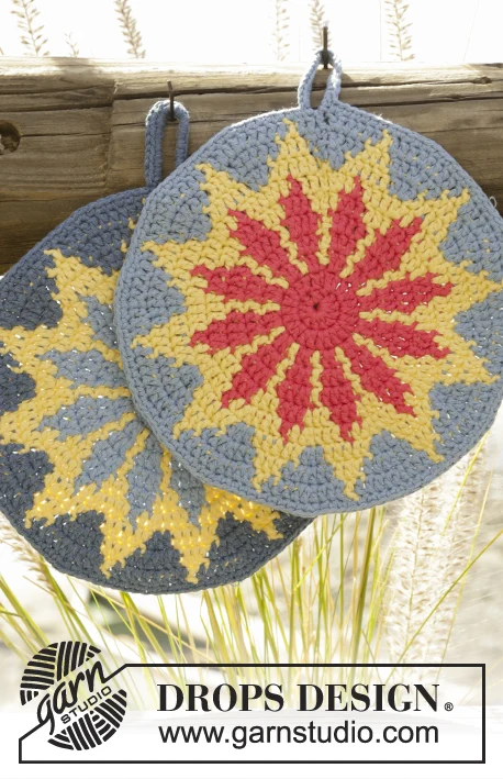 Crochet round DROPS pan in "Paris" with multi-colored pattern.