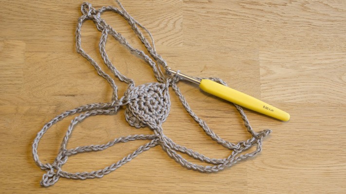 Sew the ropes together at the top and crochet a ring, crochet 8 ch, pick up for a ring and crochet 12 sc around the ring.