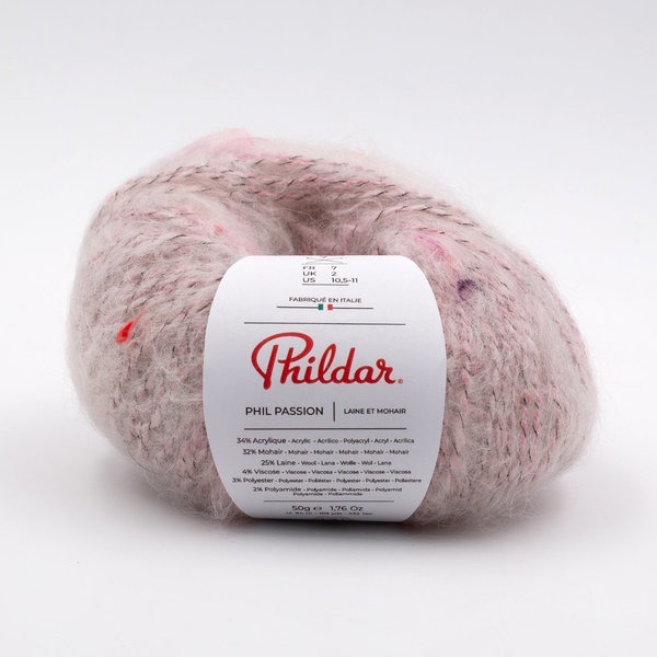 Passion from Phildar is an imaginative yarn with a wonderful life and a lovely play of colors built into the yarn's structure. The yarn has a tweed element and also consists of six different materials, of which the soft mohair and the lovely wool in particular leave their mark on the yarn and make it soft, airy and warm.